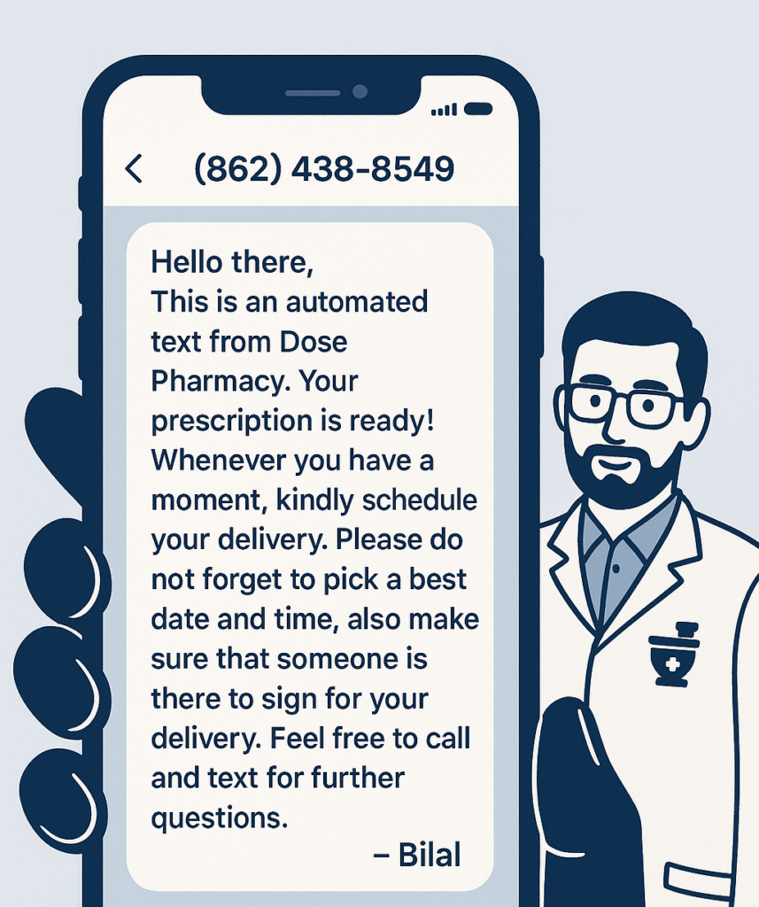 Next time your doctor asks, “Which pharmacy should we send it to?” just say, “Dose.” Any doctor can prescribe to Dose — no account needed beforehand. As soon as we receive your prescription, we’ll text you at the number your doctor provides.